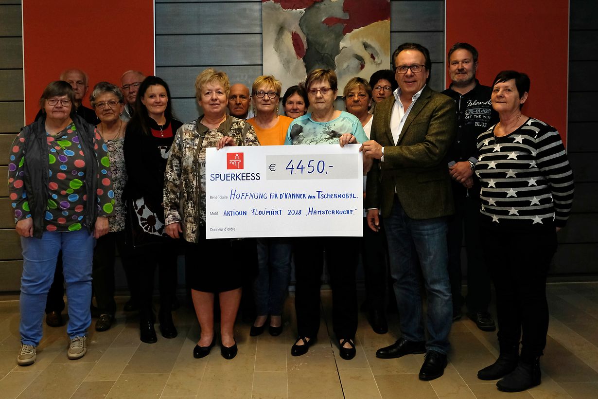 Anschliessend wurde seitens Jeanne Kneip der Vereinigung Hamsterkuerf-Floumärt ein ansehnlicher Scheck in Höhe von 4.450 € an HKT überreicht, derweil Misch Gales die Versammlung mit einem Bildvortrag über die Reise nach Slavgorod 2018 abrundete.