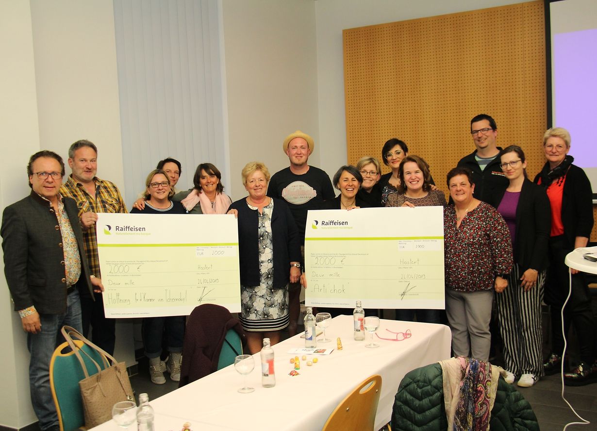 Anlässlich der diesjährigen Generalversammlung überreichte die Präsidentin Edith Winandy, zusammen mit Sekretärin Nathalie Schumacher sowie Vorstandsmitglied Michel Gales, im Beisein weiterer Mitglieder der Vereinigung "Theaterkëscht Hueschtert", zwei Schecks in Höhe von jeweils 2.000 € an die Vereinigungen "Arti'Chok a.s.b.l." sowie "Hoffnung fir d'Kanner vun d'Tschernobyl a.s.b.l.".