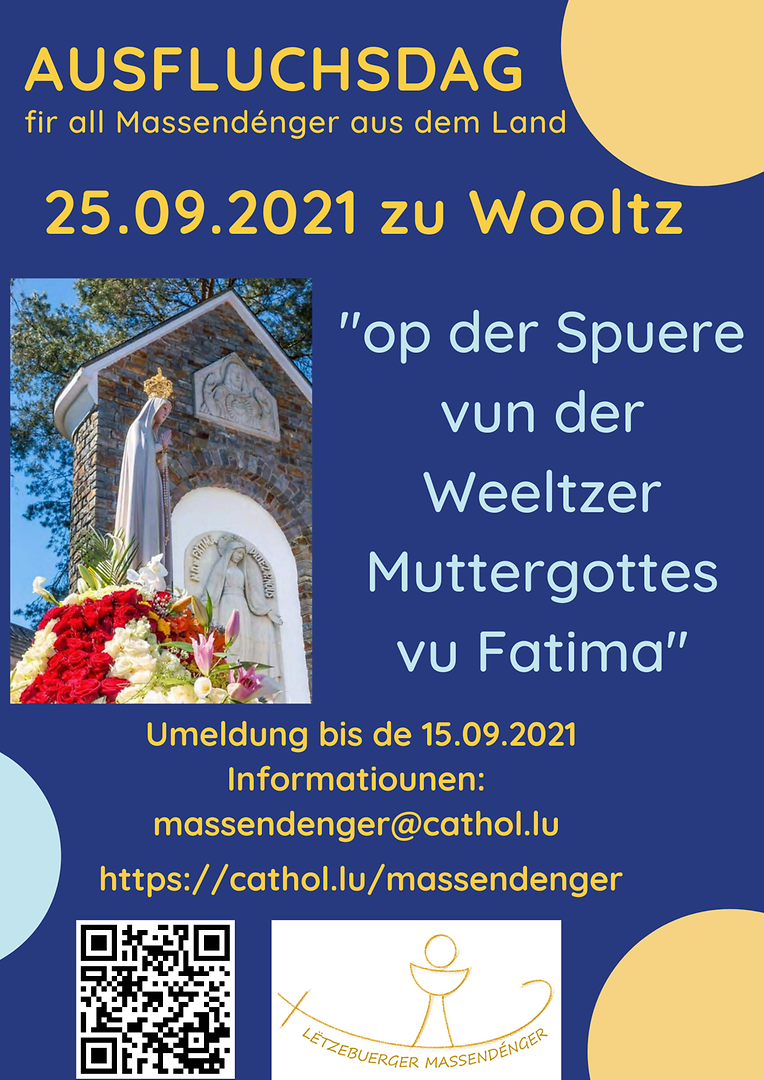 Et ass scho bal eng Traditioun: den Ausfluchsdag vun de Lëtzebuerger Massendénger um leschte Samschdeg am September. Dëst Joer hu mir eis zu Wooltz getraff fir Wooltz op de „Spueren vun der Muttergottes vu Fatima“ kennenzeléieren.